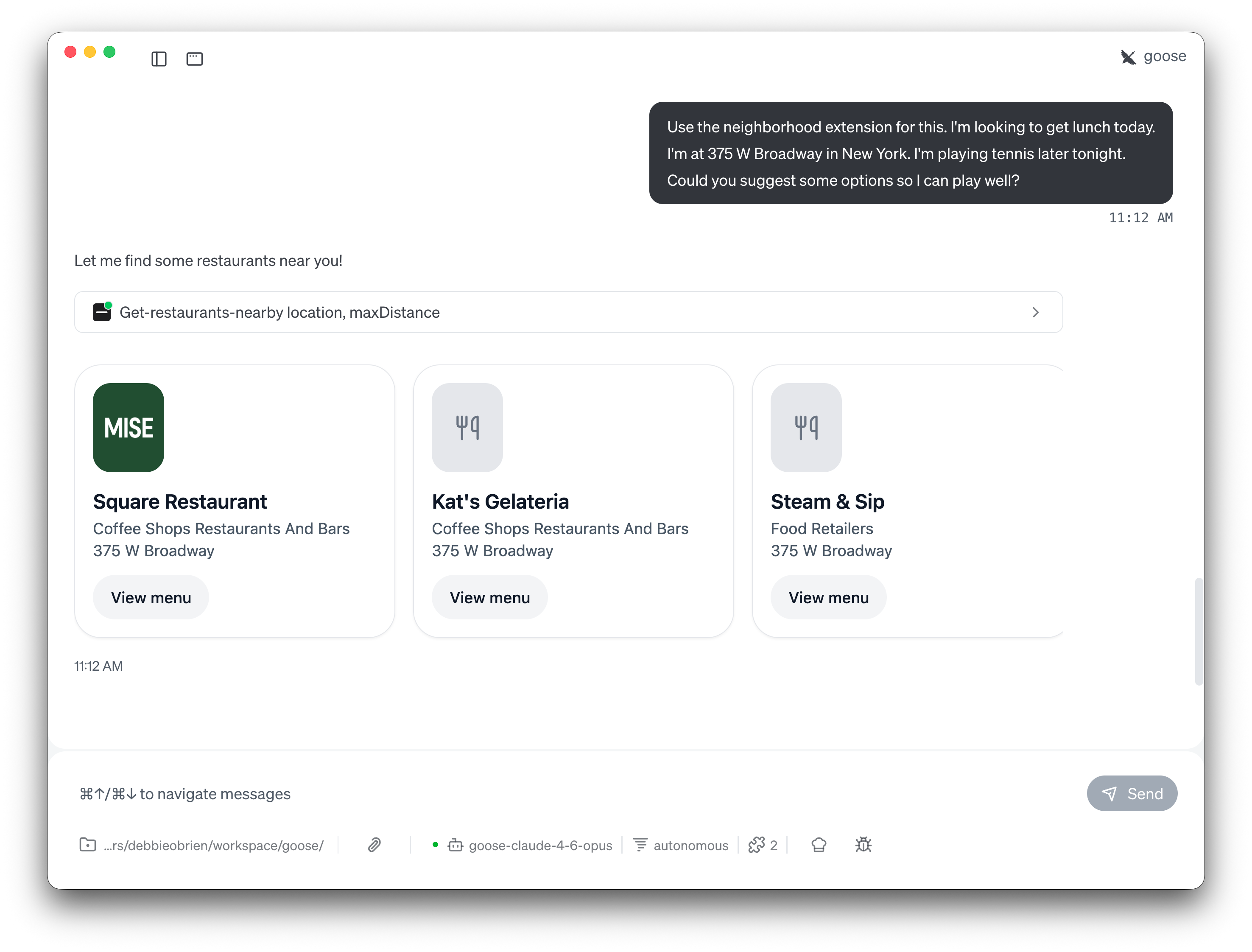 Neighborhood is most powerful when goose combines it with context from your day — your schedule, your goals, your dietary needs. Instead of just searching for food, you can ask goose to reason about what to eat based on what you're doing.
