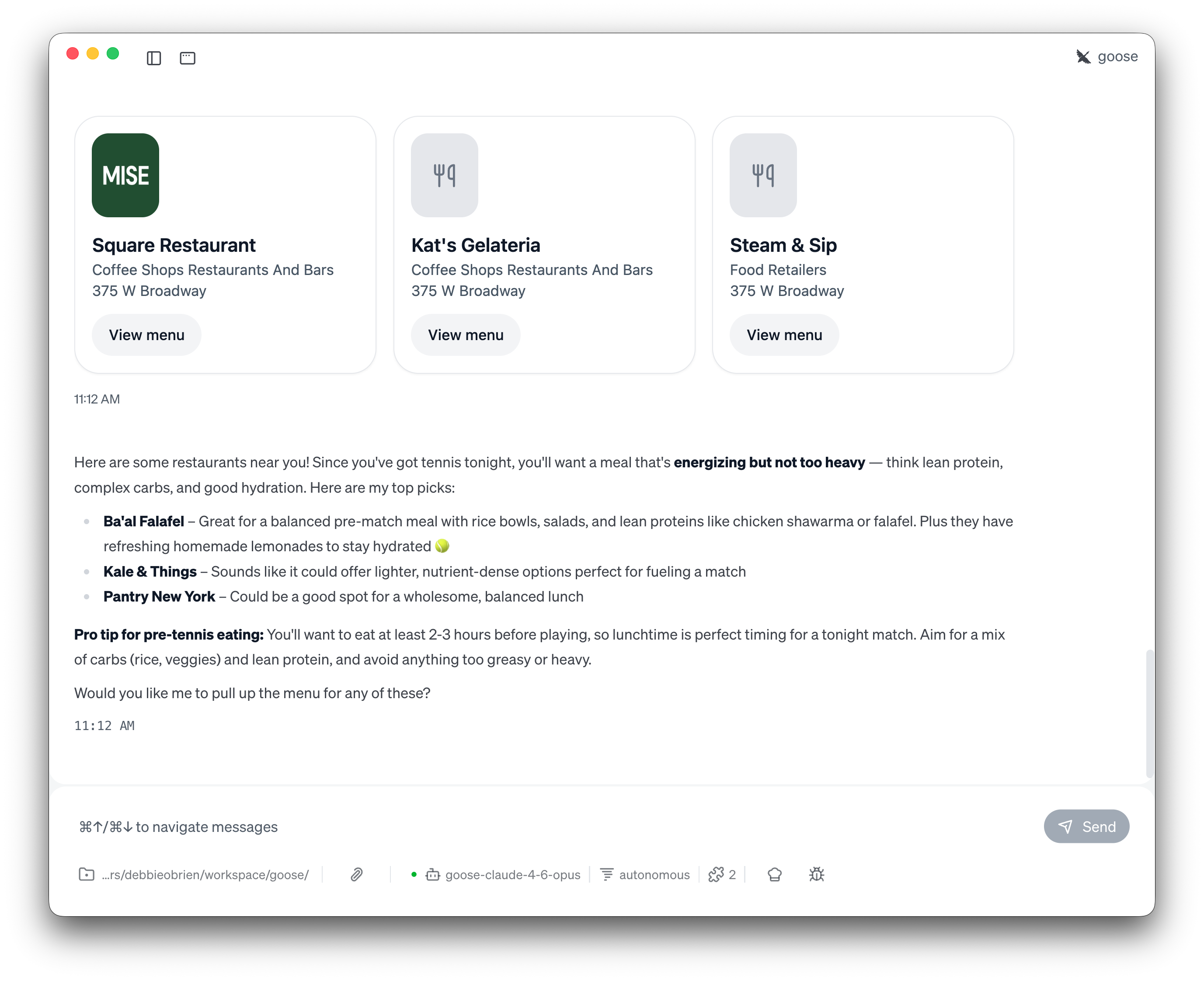 Neighborhood is most powerful when goose combines it with context from your day — your schedule, your goals, your dietary needs. Instead of just searching for food, you can ask goose to reason about what to eat based on what you're doing.